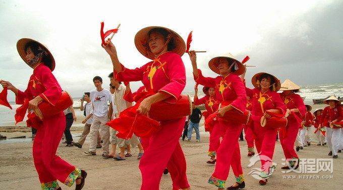 2、祭神:祭神的具体时间为节日的当天下午三点钟左右。祭祀仪式开始后,首先由主祭者带领人们迎接来自海上、天宫各位神灵、祖先进入神位,读祭文,紧接着是向诸神敬酒和献礼。在祭祀之后进行娱神的过程中,表演内容不但穿插了人们喜闻乐见、反映生活情趣的古诗词演唱、历史故事说唱等,还要唱'进香歌'、跳'进香舞'、'进酒舞'、'天灯舞'等。