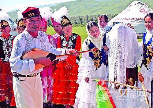 哈萨克族的婚礼一般要举行三天,第一天,新郎带领伴郎还有各种贺礼前去娶亲,女方会迎接招待他们。接受亲朋好友、左邻右舍的贺喜。第二天休息一天,第三天正式娶新娘。在这一天,调皮的伴娘会把新娘藏起来,这时伴郎要骑在马上,与伴娘逗趣对歌,蠃了方能进门接新娘。有时,其中的伴郎会乘其不备,从马背上跃进毡房,并从众伴娘围攻下夺门而出,如果跑不出来,就会招来嘲讽,没脸见人,还要向伴娘送礼。