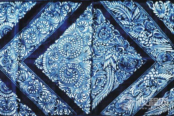 染色完毕将碱性的青杠木烧成灰加入沸水以脱去油脂,显出青底蓝、白花的图案,现在也有用洗衣粉脱脂的,可达到同样的效果。脱脂后用清水漂洗、晾干、碾平,整个制作过程即告完成。