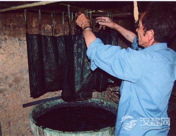 图案画好后开始染色,枫香印染的染色材料及工艺和蜡染基本一样,也是用蓝靛浸染,小岩脚称为土靛。把绘制好的作品投入事先调好染料的染缸内进行浸染,待作品完全湿透,沉入缸内,两三个小时之后将衣服捞起悬挂晾干,使布料上的染料和空气充分接触,使其氧化。如此反复浸泡三次,随着每一次浸染的加深,作品已经拥有典雅厚实的色调。