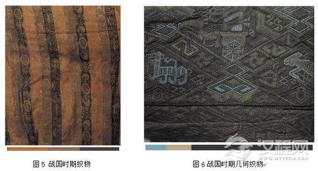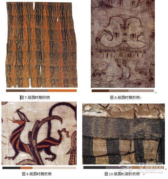 长沙仰天湖楚文化遗址和信阳楚文化遗址出土了精美的彩绘木俑服饰。在湖北、湖南等楚墓中出土了大量的织锦、绢、绸、纱等织物,其中有深棕色地红黄绫纹锦、朱红条暗花对龙对凤纹锦、藕色的方形纱手帕等,这些遗物结构严谨,织造精密,经历了二千多年,色彩仍然鲜艳。这些春秋战国时期的纺织品色彩遗物,表明春秋战国时期的纺织、刺绣有了相当高的文化艺术水准。