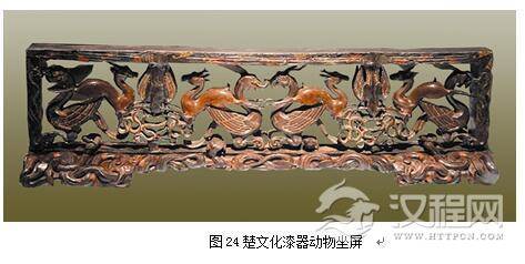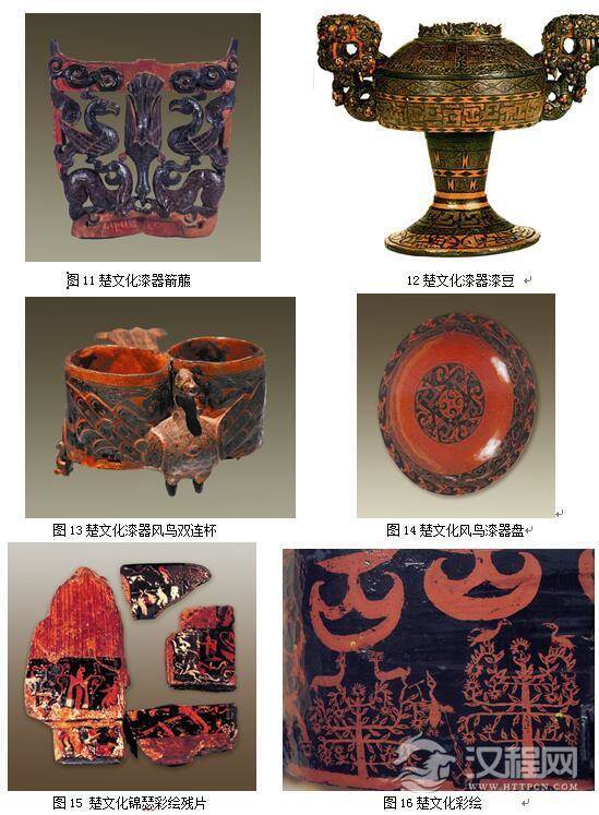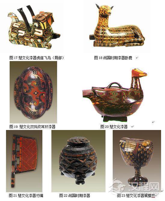 起始于商朝的古代漆器文化,到了春秋战国时期,漆器工艺已经得到了空前的发展。战国时期的漆器大都出土楚墓,楚国的漆器主要分布在湖北江陵地区,一部分在湖南信阳地区。楚国漆器的彩绘艺术风格独特,色彩运用浑厚,以红、黑色为主色调,其他色彩作为点缀,给予华丽庄重的色彩视觉感。湖北江陵雨台山楚墓出土的漆器“虎座飞鸟”,被誉为战国时期楚文化的象征。因此,楚国的漆器色彩文化在春秋战国时期的色彩文化中占有重要的地位。(图11-35)