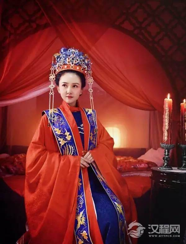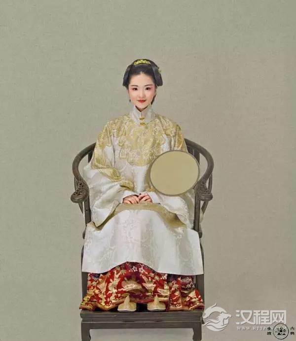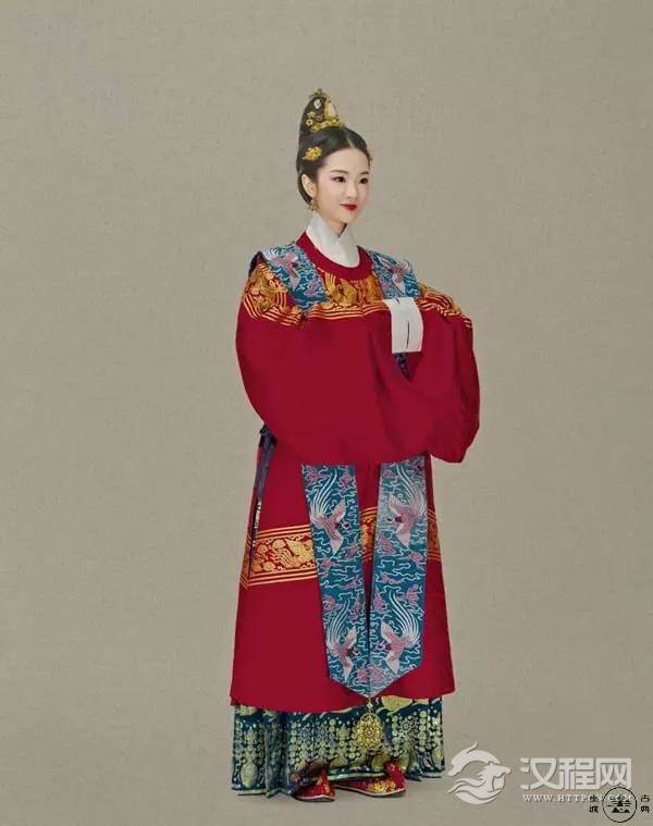 皇后之服,以百禽之首凤凰为其高贵象征,与龙相配。服真红大袖衫,上面织绣龙凤纹,加霞帔和红褙子,下穿红罗长裙。头戴龙凤冠,以金丝网为胎,上缀点翠凤凰,并挂有珠宝流苏,冠后下方有左右各三扇博鬓,展开后如同五彩缤纷的凤尾。