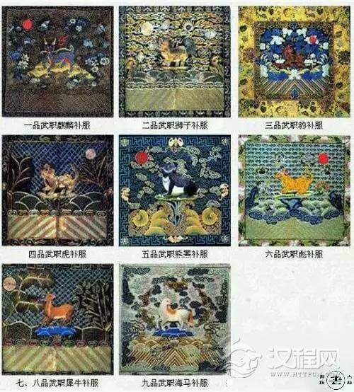 武官:兽纹以陆上最凶猛的野兽为肯。一品麒麟、二品狮子,三品豹、四品虎,五品熊罴,六品彪、七品八品犀牛,九品海马。