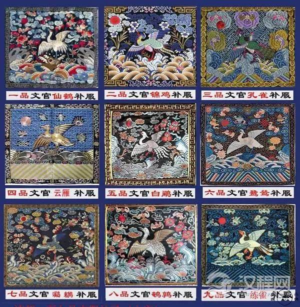 文官:禽纹以自然界中优雅、美丽的鸟类为贵。一品仙鹤,二品锦鸡,三品孔雀,四品云雁,五品白鹇,六品鹭鸶,七品鸂鶒,八品黄鹂,九品鹌鹑。