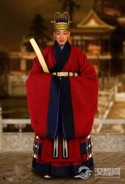 文武百官在祭天地、庆礼、正旦冬至等重大场合穿着的服装,头上戴梁冠,着赤罗裳,青缘青饰,以冠上的梁数区别官品等级,饰物以玉为贵。