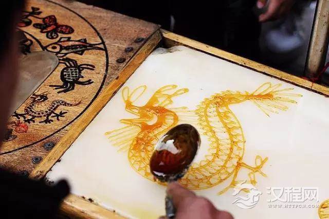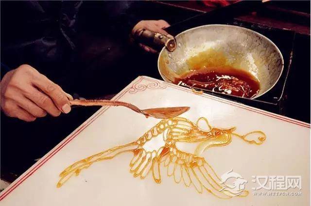 画糖人,顾名思义是以糖为材料来进行造型的,所用的工具仅一勺一铲,而糖料一般是红、白糖加上少许饴糖放在炉子上用文火熬制,熬到可以牵丝时即可以用来浇铸造型了。在绘制造型时,艺人用小汤勺舀起溶化了的糖汁,在石板上飞快地来回浇铸,画出造型。
