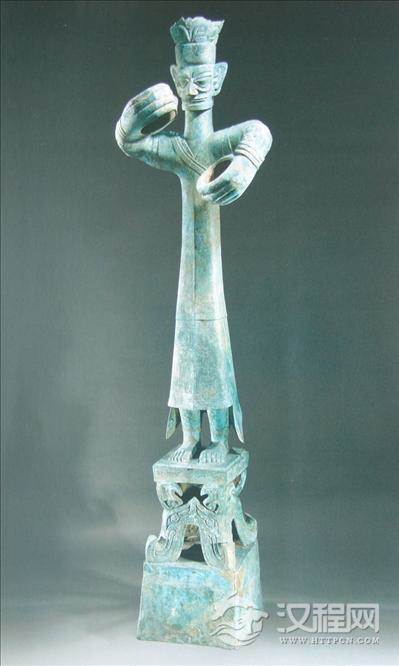 双手后支地,头上仰。戴圆箍形“頍”,直领对襟衣,衣饰云纹和目雷纹。下着分裆裤,腹胯间有一大牛面纹。足穿高帮鞋。