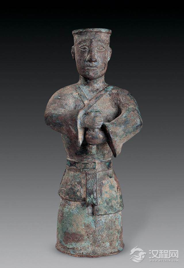 头顶左右双髻,双手拱抱腰前,作鞠躬状,穿对襟长袍,宽长袖,衣长及足,足似穿高帮鞋。