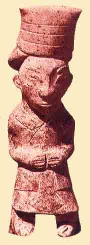 华冠周边有突棱,冠前后作直角式,与上例异,紧身衣裤饰云纹,臀部也有一⊕纹