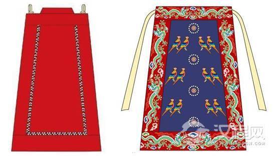 古人将皮毛先遮于前体,再遮后体,后来用骨针将蔽前与蔽后的两片连缀缝台起来,形成了最早的“裳”。而最早只遮于前的“蔽膝”又称为“芾”,后演变为皇帝冕服的附件之一。“芾,太古蔽膝之象,冕服谓之芾”(《诗经》郑笺)。