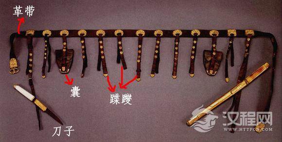 “五品以上,幞头,亦曰折上巾,紫袍,牙笏,金玉带。文官佩手巾、算袋、刀子、砺石、金鱼袋;武官楎七事:佩刀、刀子、磨石、契真、哕厥、针筒、火石袋。”----《辽史》