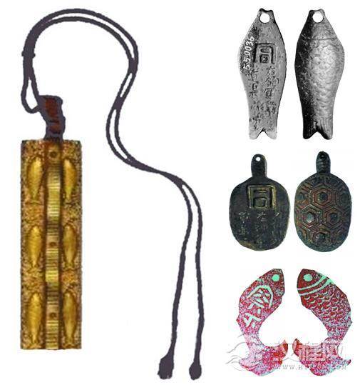 鱼袋(左)、鱼符龟符(右上中)、金代鱼符(右下)