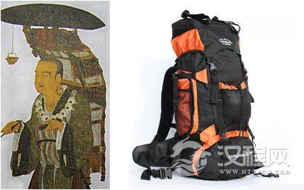 行脚僧图中经常可以看到双肩背的行囊,但多为竹木和布或网结合的结构,其实它更像是一件可背的家具。图中这件行囊虽然形状、功能和现代背包类似,形制、做法上就相差太远了。