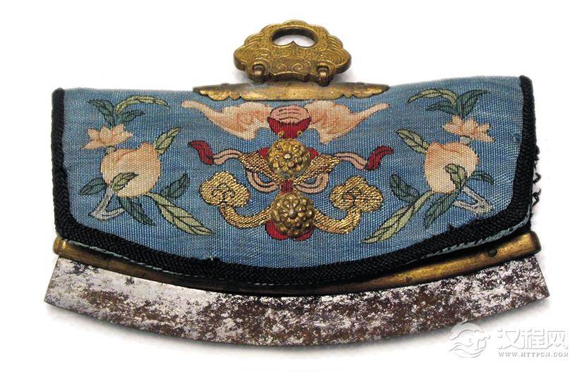 火镰袋是储存火镰(一种古代的取火器物)的盒子,有前盖,防止物品掉出。而今火镰袋渐渐演变成为一种装饰品,而最为出名的是赫哲族的火镰袋。图为清缂丝桃福纹荷包火镰。