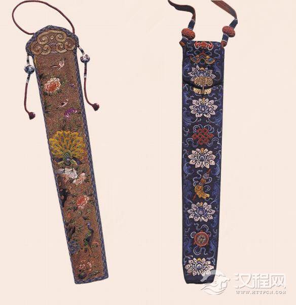 折扇是清朝文人雅士随身携带的配饰,历来文人墨客都喜欢在折扇上题诗作作画,为了不让扇子上面的字迹模糊,保护好折扇,而且扇套上有花纹等,为了体现了使用者的身份和趣味,人们用扇袋来装折扇。古代的折扇一般是用竹,木,羽毛.丝绸等做成,扇袋则用丝绸来制作。在南朝的官服中要求肩上要挂包袋,包袋中盛放一些奏章等,在当时称此包袋为紫荷。