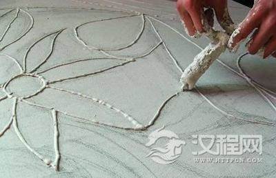 第四步:作白乳胶与立得粉调和成浆状,灌入空白乳胶瓶内,白乳胶瓶的口,根据线条的粗细,用刀切成同样大小的口,用手挤白乳胶瓶,沿着画面的轮廓线立线。如果没有白乳胶瓶可用笔调沥粉浆立线。