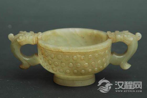 明白玉鼓钉纹双龙耳杯整玉雕成,杯直口,弧腹,高圈足。外壁雕鼓钉纹饰,口沿起边。双龙耳,双龙口含杯沿,尾抵杯身,龙身拱起作杯耳,纹饰简约,雕工娴熟。