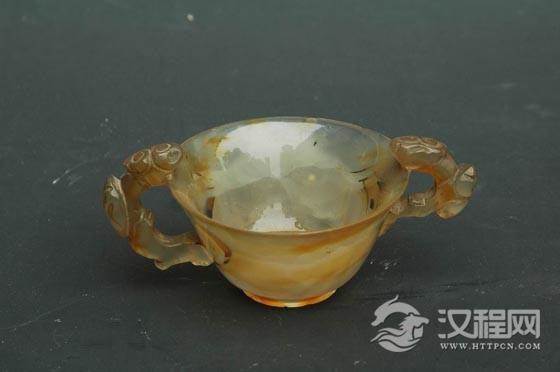 明玛瑙双螭耳杯整件器以玛瑙整体雕出,杯敞口,深腹,圈足。杯身对称有螭虎作耳,杯壁薄,而螭虎粗状,对比鲜明,相得益彰。