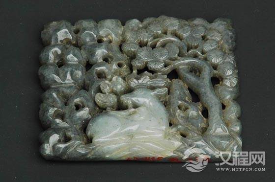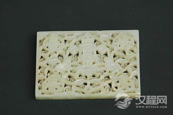 明青白玉寿字兔纹饰件:长方形,双层通雕,浅通雕卷草纹为地。正中为花角菱形开光,把长方形四角分切,四角桃形开光内雕“万喜长春”4字,周边有枝叶相衬。菱形开光内对称雕一对玉兔,中间为折枝菊花托一“寿”字,构图规整。