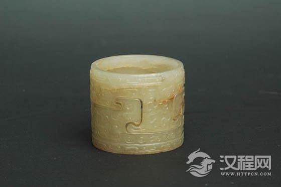 明青白玉云雷纹连环桶青白玉,圆筒状,壁较薄。分上下两部份,以不规则凸凹口相嵌,随形凸雕弦边,表面浅浮雕云雷纹,上下口沿边雕勾云纹一周,造型特别。
