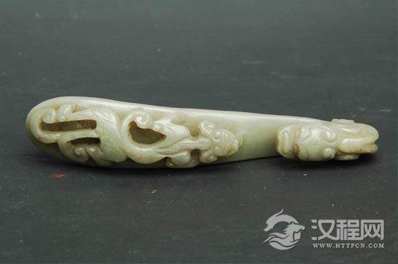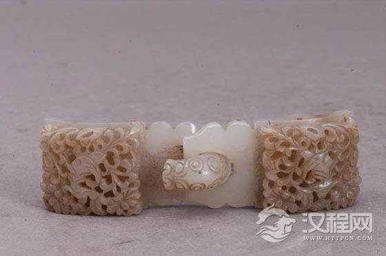 清白玉凤穿牡丹纹带扣:白玉,带扣分两部分,一边为扣,一边为钩。扣为云状出孔,后连透雕凤穿牡丹图案的扣身。钩为云状出钩,浅刻卷草纹,后连透雕凤穿牡丹图案的钩身,雕工精细。
