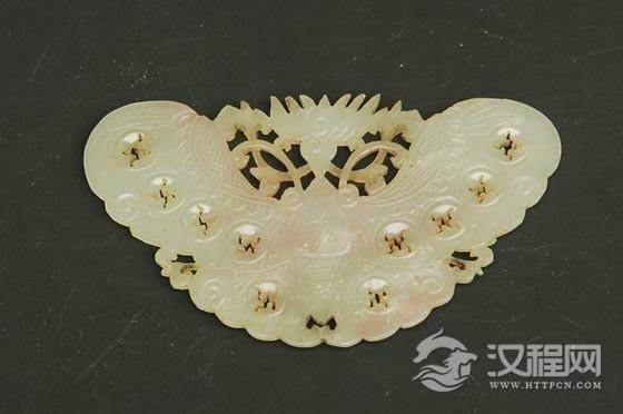 清白玉蝴蝶:白玉,薄片上以镂雕、浮雕、浅刻等技法,雕出口吐莲花的蝴蝶,莲花枝叶缠绕通透,蝶翅对称镂空五个“卍”字,并有复杂的浅刻花纹,造工细致。