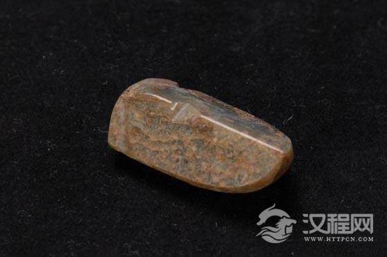 汉代玉灰褐色。前端用简单的线条斜刻突起的双眼,背有脊棱,在靠眼部三分之一的脊棱上用刀刻出一小凹口,着刀无几便勾划出蝉的头部,蝉的尾部呈椭圆状,腹部较大,无穿。