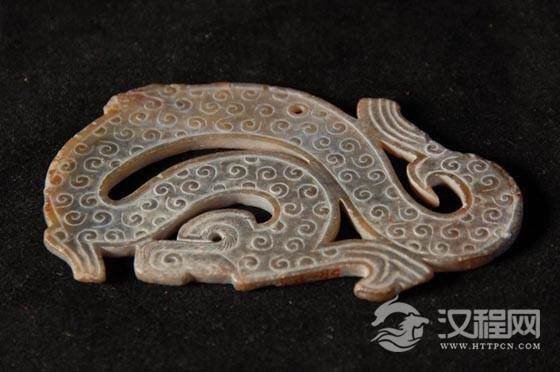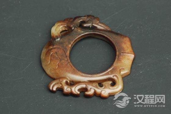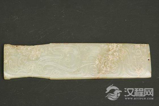 汉青玉通雕螭纹佩玉质坚致,呈牙黄色,一边有土红色斑。佩上尖下圆,中有圆孔,表面镂刻细线卷云纹,背平无纹,两侧透雕首尾相抵的螭,雕工纯熟,纹饰简约。