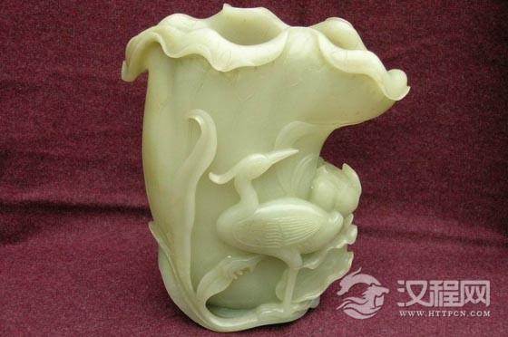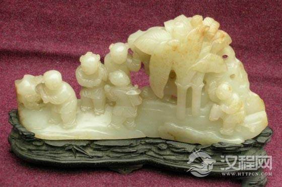 清白玉五子登科座件:用圆雕技法,以岭南地区的芭蕉为背景,雕出树下五孩童在玩耍,各得其乐。这类玉雕件名为五子登科,抓住人们希望儿孙日后成材的“望子成龙”心理,取其吉利之意。此件雕工精细,线纹流畅自如,富有生活气息。