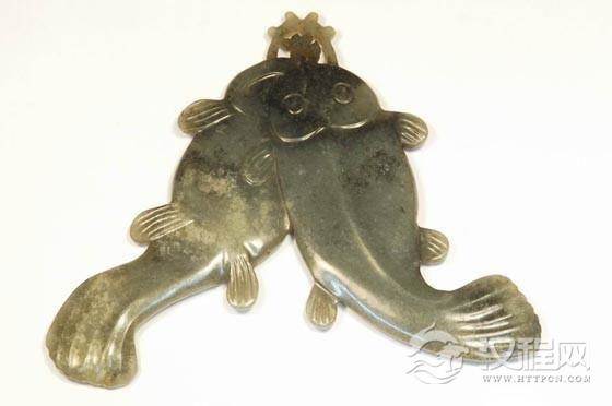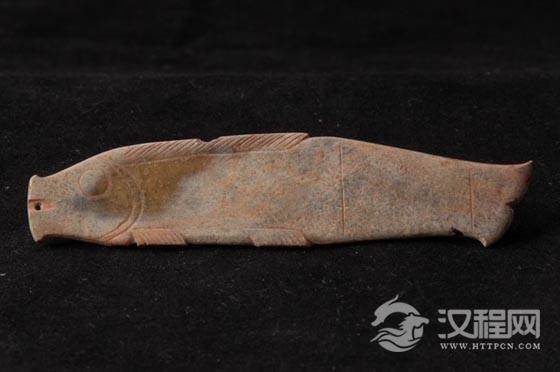商鱼纹佩:玉青白色,器身扁平。口微张,两条阴刻弧线刻划出鱼鳃,二排阴刻短线分别刻出背鳍和腹鳍,鱼的尾部磨成锋刃,可作小刀。鱼的背面残留部分朱砂。整条鱼佩线条简单,着刀无几,而形神毕肖。
