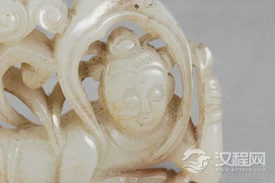 白玉质,局部有赭色沁斑,片状镂空。飞天为侧卧式,高髻盘于头顶,上身裸,下身着裳。左手执花举于耳侧,右手平托胸前,身披飘带,衬一朵流云。飞天为佛教人物,早期多作男像,后演变成娇柔的女性。作品雕功流畅,人物体态轻盈,面目慈祥,给人强烈的飘动感。