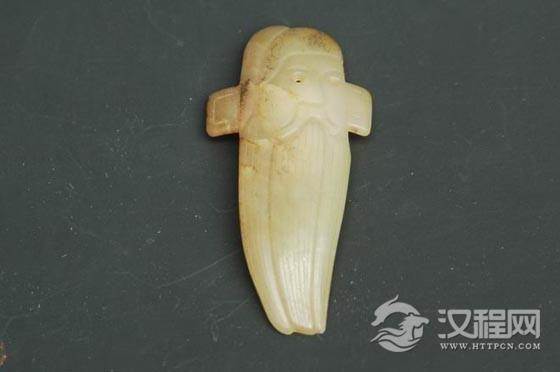 宋青玉人面佩:青玉有沁色,表面呈弧形。雕男者面相,长须飘拂,两眼成孔,头戴官帽,帽翅伸出两侧,五官刻划细致。