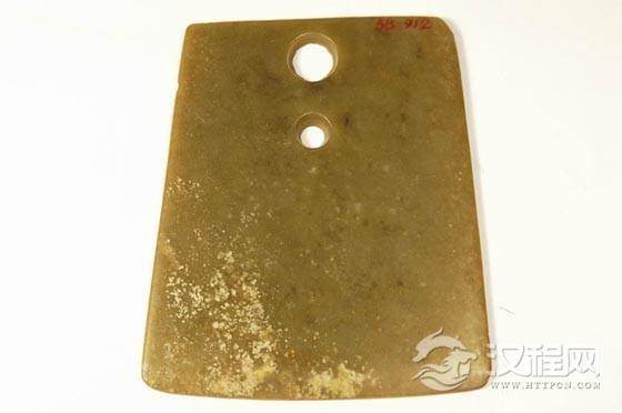 新石器青玉斧:玉料呈灰黄色,有沁斑。扁平体,近长方形,上窄下宽,四角弧圆,表面光洁无纹。上端中部有大、小各一圆孔。