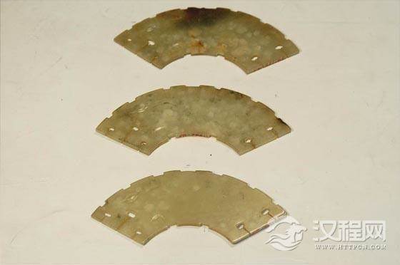 玉料呈青白色,共计三件,局部有白色、墨绿色沁斑和红色绺,体扁平,甚薄。器呈扇形,上、下边缘弧形有齿脊,两端平齐,一端有三孔,其上浅刻一龙眼,另一端有二孔。