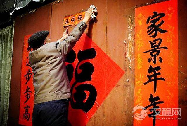 贴春联——是从两千多年前战国时期的“桃梗”演变而来的。《淮南子》上说,桃符(即桃梗)是桃木刻成的。上面刻着灭降福的咒语,一年一换。五代后蜀皇帝孟昶在过春节时心血来潮,令人将桃树削片,他提笔在上面题写了联句:“新年纳余庆,佳节号长春”。这就是中国最早的春联了。至于春联这一名称的正式诞生,则在明朝。明朝开国皇帝朱元璋建都金陵后,曾在除夕时下旨:“公卿士庶之家,须写春联一副,以缀新年”。以后,春联得以推广,沿袭至今过年时,各家各户都要贴春联。