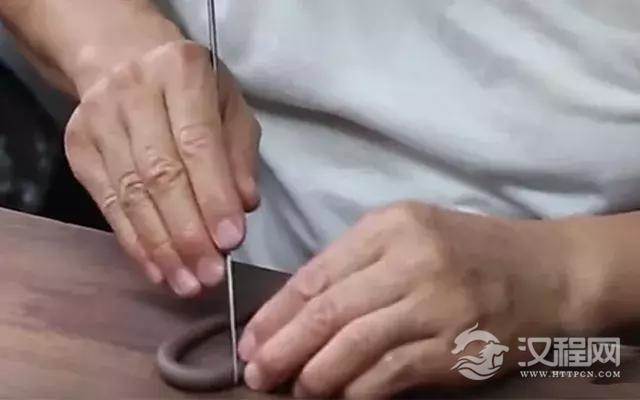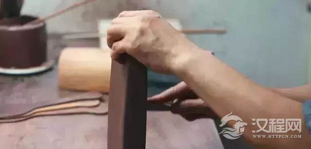 开泥时一定要按照捶好的水平方向呈90度切开,这样才能把层层相叠的泥料继续在原来的平面上延展,这样打出的泥片、泥条强度大、延展性好,犹如一把好的宝剑的内质。先用木搭子的半圆侧面有序拍打,手腕稍带一点“转”的动作。转,就是碾压推挤作用,使泥片很快均匀地延展开来。再用木搭子的微微凸起的底面继续拍打,最后拍打至泥片厚度为2.5毫米左右,在肉眼无法看见的断面依然层层相叠,方向不乱。