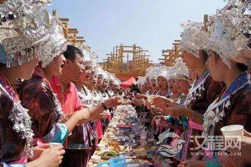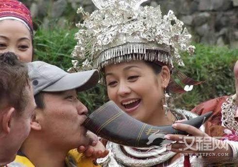 每有重大喜庆活动或有贵宾来临,热情好客的主人往往会在寨门前或家门口设置拦路酒。少则三五道,多则十二道。他们手中的牛角杯你可别接,否则一松手,那沉甸甸的牛角酒就非你莫属了。除此之外,就形式而言,还有进门酒、敬客酒、交杯酒、送客酒等等。