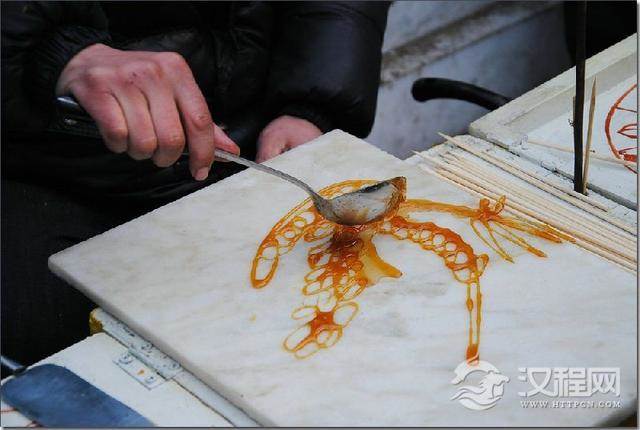 石板多用光滑冰凉的大理石,用时在上面涂一层防粘的油。糖稀熬好后,用小勺舀起,在石板上浇出线条,组成图案。因糖稀在石板上很快就冷却了,所以要一气呵成。糖人的制作过程很是精彩。待造型完成后,用小铲刀将糖画铲起,粘上竹签,稍候凝结即成。