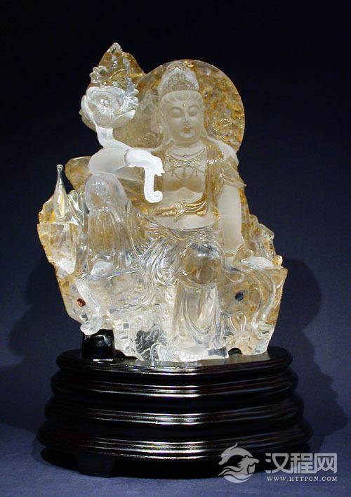 该尊《观音》22×28CM,以整块黄水晶雕刻创作,黄水晶是一种 颇为罕有,产量较少的水晶。作品中水晶透彻质感把观音慈仁的神态表 情刻画得淋漓尽致,手执莲花姿态高雅、自然。雅服饰的皱褶刻画得犹 如飘动的感觉,表现极具细腻完美,再现了高超的工艺和匠心独具的艺 术构思,作品采用立雕形式构思设计表现,技法则运用了镂雕、圆雕等 多种刀法。作品造型独特,含蓄,展现出了极富浓郁的东方文化底蕴和深邃的宗教文化。