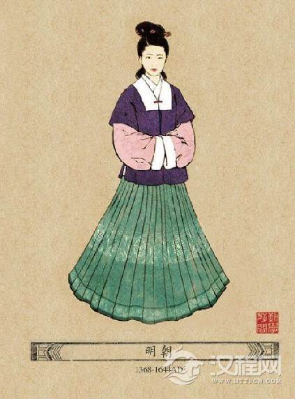 明代以汉族传统服装为主体,明代女性习惯在裙子外罩一件背子衫或是云肩。凤冠霞帔是明代妇女的礼服,是后妃在参加祭祀等重大典礼时使用的服饰。整个冠上缀着龙凤,搭配霞帔一起穿著。明代较多使用的纽扣,主要用在礼服上,常服很少使用,明末时才有所普及。明代普通百姓的服装或长、或短、或衫、或裙,基本上承袭了旧传统,且品种十分丰富。服饰用色方面,平民妻女只能衣紫、绿、桃红等色,以免与官服正色相混;劳动大众只许用褐色。