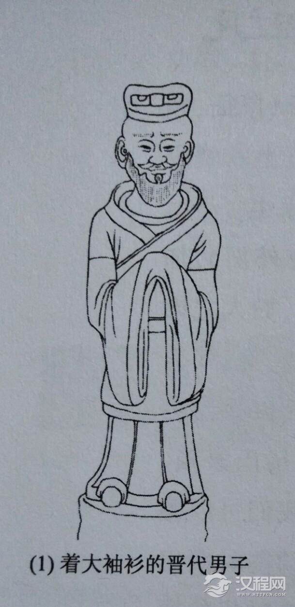 衫为交领直襟式,长衣大袖,袖口不收缩而宽敞,有单、夹两种。另有对襟式衫,可开胸而穿不系衣带。大袖衫因穿着方便又能体现人的洒脱和娴雅之风,所以大受欢迎,以至从文士到劳役都相习成风。晋代文学中著名的竹林七贤,崇尚虚无而轻视礼法,放任自我,吟啸山林,他们的服装就是大袖衫,敞领开怀,解衣当风。或捋袖至肩,或分襟露足,或退衣出臂,或去冠散发,全然一副与世隔绝、隐居山林的悠闲洒脱之态。