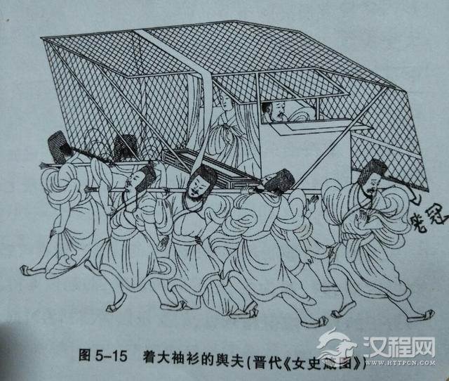 大袖衫是汉袍的一种发展和定型,趋简、适体可说是大袖衫形成的本质原因。大袖衫将袍的礼服形制削减,便服性质扩增,所以衫是便装外服最受人们欢迎的服装,也是服装和日常生活紧密结合的成熟的标志。此时不论上等官员,还是下等侍从也都服大袖衫,晋顾恺之绘的《女史箴图》中有八个舆夫,都是大袖飘飘、细纱笼巾的晋代衣冠。