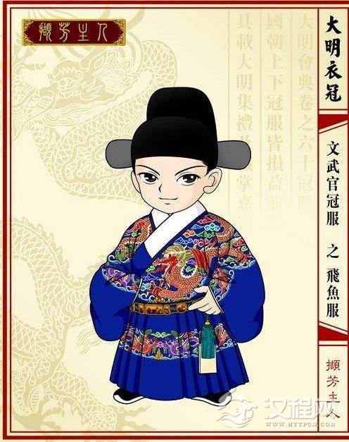 飞鱼服是次于蟒袍的一种盛大服饰。至正德间,如武弁自参(将)游(击)以下,都得飞鱼服。嘉靖、隆庆间,这种服饰也颂及六部大臣及出镇视师大帅等,有恩赐而服者。