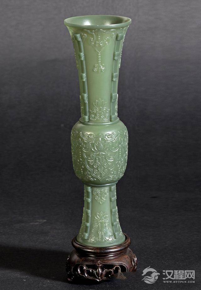 作品简介:花觚始于元代,主要流行于明嘉靖、万历至清乾隆这一段时期。花觚除了陈设之外,民间多用于插花、布置厅堂。此作选用温润的碧玉为材,雕刻的花觚造型隽秀,端庄大方,线条变化十分丰富,周身纹饰细密,喇叭口处轻薄如丝,鼓腹饱满,凤尾稳重,风格典雅。