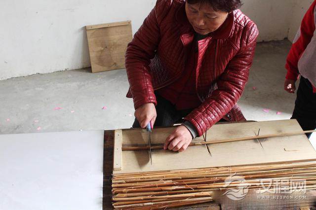 村民成永先说:“她娘家是有着传统手工糊制鱼灯笼的涛雒镇成家廒头村,至今已经有上百年的制作历史了。据说原来村里800多户人家,80%从事鱼灯笼制作。可如今,传承坚持下来做的不过两家”。图为成永娟在裁切蒲草秆。