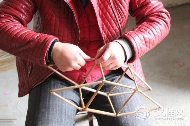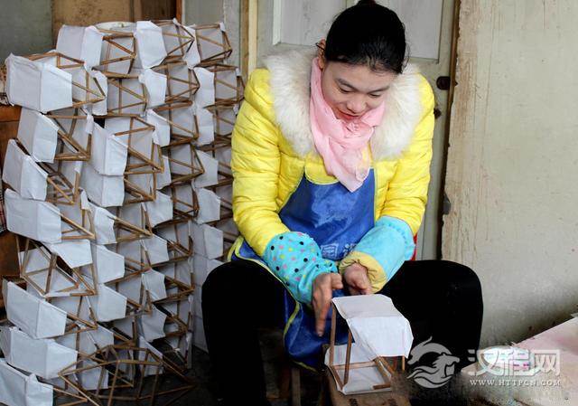 图为刘从霞把纸张用浆糊糊在蒲草秆框架上,一个鱼形纸灯笼的模样逐渐成型;