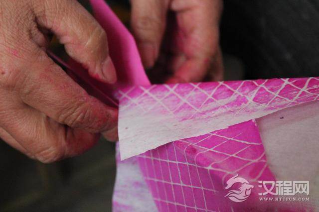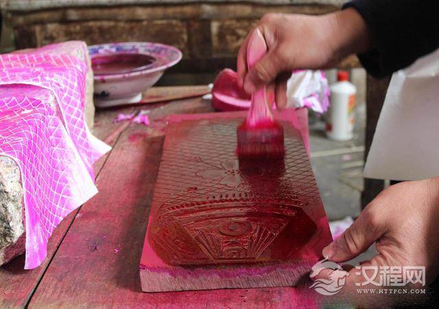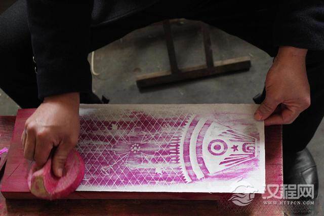 图为艺人在刻有鱼形图案的印板上抹颜料,铺上白纸拓制图案;
