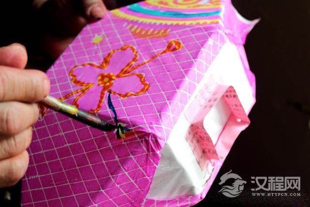 最后糊上鱼嘴、鱼尾再装上提手,一个漂亮的鱼灯笼就制作完成了。图为宋春年制作鱼起手。