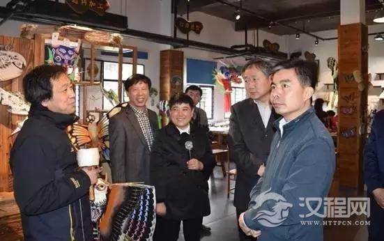 湖北省人社厅副厅长曾向阳(右二)一行听取湖北省民间工艺技师学院院长许小兰汇报